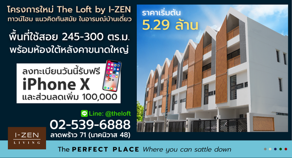 เดอะ ลอฟท์ บาย ไอเซ็น นาคนิวาส 48 เดอะ ลอฟท์ บาย ไอเซ็น นาคนิวาส 48 ทาวน์โฮมแนวคิดทันสมัย พื้นที่ใช้สอย 245 - 300 ตร.ม. พร้อมห้องใต้หลังคาขนาดใหญ่ ลงทะเบียนออนไลน์ ลด 100,000 บาท พร้อมรับฟรี iPhone X
