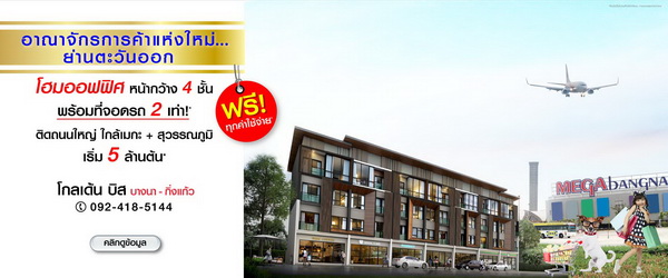 โกลเด้น บิส บางนา-กิ่งแก้ว Home office (โฮมออฟฟิศ) โอกาสทอง...ของคนอยากรวย!! เปิดตัวอาณาจักรการค้าแห่งใหม่ ย่านตะวันออก ติดถนนใหญ่ ใกล้เมกะบางนา+สุวรรณภูมิ โฮมออฟฟิศ หน้ากว้าง 4 ชั้น พร้อมที่จอดรถถึง 2 เท่า! คุ้มค่า เกินราคา ฟรี! ทุกค่าใช้จ่าย* เริ่ม 5 ล้านต้น
