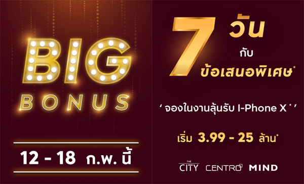 โปรโมชั่น: Big Bonus 12 - 18 กุมภาพันธ์ 2561 นี้ 7 วัน กับข้อเสนอพิเศษ จองในงานลุ้นรับ iPhone X* เริ่ม 3.99 - 25 ล้านบาท