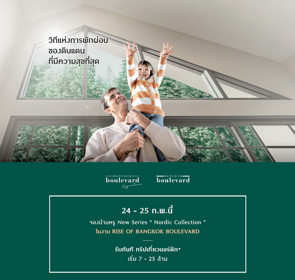 โปรโมชั่น: 24 - 25 กุมภาพันธ์ 2561 จองบ้านหรู New Series "Nordic Collection" ในงาน RISE OF BANGKOK BOULEVARD รับทันที ทริปเที่ยวนอร์ดิก เริ่ม 7 - 25 ล้านบาท