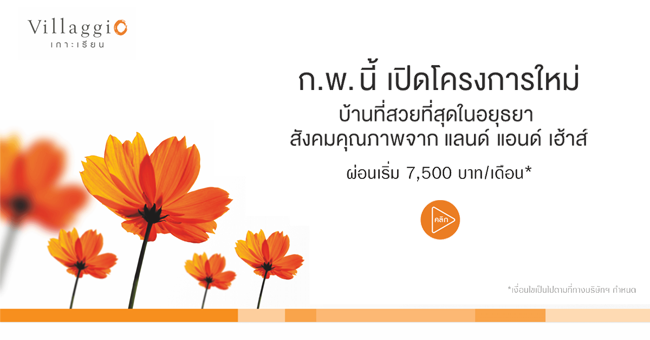 บริษัท แลนด์ แอนด์ เฮ้าส์ จำกัด (มหาชน) เตรียมเปิดตัวบ้านโครงการใหม่ "วิลลาจจิโอ เกาะเรียน (Villagio Kaorian)" บ้านที่สวยที่สุดในอยุธยา บนสังคมคุณภาพ ผ่อนเริ่ม 7,500 บาท/เดือน* โดยเปิดให้ลงทะเบียนรับสิทธิพิเศษภายในเดือนกุมภาพันธ์นี้ ผู้ที่สนใจคลิกลงทะเบียนได้ที่ลิงก์ด้านล่าง และสามารถติดตามความคืบหน้าได้ที่เช็คราคาดอทคอม* เงื่อนไขเป็นไปตามบริษัทกำหนดสนใจสอบถามเพิ่มเติม โทร. 1198 หรือทางเว็บไซต์ www.lh.co.thแท็กที่เกี่ยวข้อง :