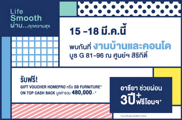 www.ananda.co.th โปรโมชั่น: 15 - 18 มีนาคม 2561 นี้ พบกับอารียาที่ งานบ้านและคอนโด บูธ G 81-96 ณ ศูนย์ฯ สิริกิติ์ รับฟรี! Gift Voucher Homepro หรือ SB Furniture* ON TOP CASH BACK มูลค่ารวม 480,000 บาท*