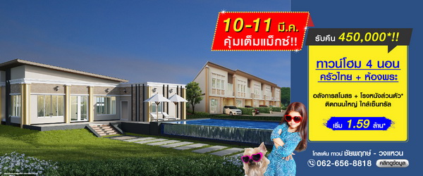 โกลเด้น ทาวน์ ชัยพฤกษ์-วงแหวน" 10-11 มี.ค. คุ้มสุดๆ จองปุ๊ป! รับคืน 450,000 บาท* ทาวน์โฮมพร้อมอยู่ 4 ห้องนอน 3 ห้องน้ำ อลังการสโมสร+โรงหนังส่วนตัว พิเศษ! ครัวไทย+ห้องพระ บนทำเลศักยภาพ ติดถนนใหญ่ ใกล้เซ็นทรัล เริ่มต้นเพียง 1.59 ล้าน*