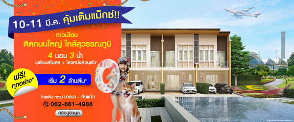 โกลเด้น ทาวน์ บางนา-กิ่งแก้ว" คุ้มเต็มแม็กซ์!! 10-11 มี.ค. จองทันที ฟรี! ทุกอย่าง... ทาวน์โฮม พร้อมอยู่ ติดถนนใหญ่ ใกล้เมกะบางนา+สุวรรณภูมิ มาพร้อมฟังก์ชัน 4 ห้องนอน 3 ห้องน้ำ พร้อมสโมสร+โรงหนังส่วนตัว เริ่ม 2 ล้านต้น*