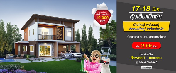โกลเด้น นีโอ ชัยพฤกษ์-วงแหวน" ห้ามพลาด!! 17-18 มี.ค. นี้ คุ้มจัดเต็ม ลงทะเบียนรับเพิ่ม 10,000 บาท* โทรจองเยี่ยมชมโครงการ โทร. 094-789-9440 พบบ้านใหญ่ พร้อมอยู่ สไตล์โมเดิร์นเรโทร 4 ห้องนอน 2 ที่จอดรถ อลังการสโมสร เดินทางสะดวก ติดถนนใหญ่ ใกล้รถไฟฟ้า เริ่ม 2.99 ล้าน*