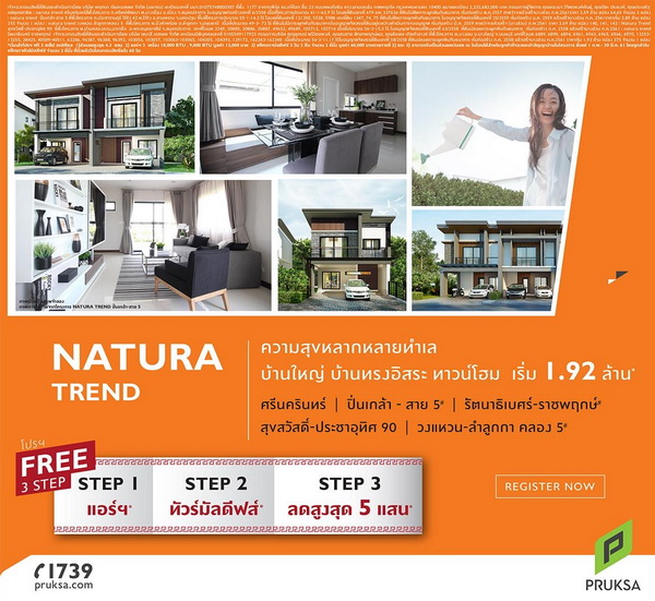 โปรโมชั่น: Natura Trend ความสุขหลากหลายทำเล บ้านใหญ่ ทรงอิสระ ทาวน์โฮม เริ่ม 1.92 ล้านบาท รับฟรี 3 Step / Step 1 แอร์* / Step 2 ทัวร์มัลดีฟส์* / Step 3 ลดสูงสุด 5 แสน*
