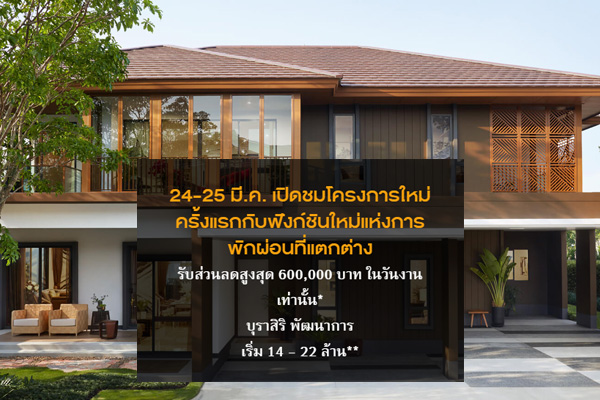 www.pruksa.com โปรโมชั่น: 24-25 มีนาคม 2561 นี้ เปิดชมโครงการใหม่ "บุราสิริ พัฒนาการ" ครั้งแรกกับฟังก์ชันใหม่แห่งการพักผ่อนที่แตกต่าง รับส่วนลดสูงสุด 600,000 บาท ในวันงานเท่านั้น เริ่ม 14 - 22 ล้านบาท
