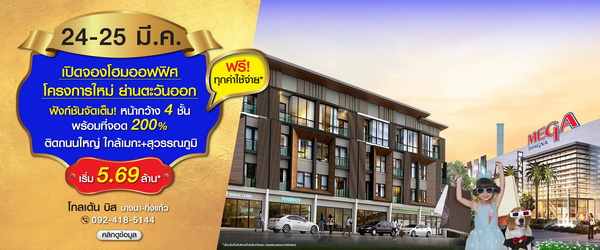 โกลเด้น บิส บางนา - กิ่งแก้ว เปิดจองโฮมออฟฟิศโครงการใหม่ ย่านตะวันออก 24 - 25 มีนาคม 2561 นี้ ฟังก์ชันจัดเต็ม! ทาวน์โฮม 4 ชั้น หน้ากว้าง 5.7 เมตร พร้อมที่จอดรถ 200% ติดถนนใหญ่ ใกล้เมกะ+สุวรรณภูมิ เริ่ม 5.69 ล้านบาท