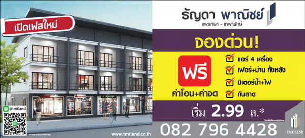 http://www.smartlandgroup.com/ โปรโมชั่น: ธัญดา พาณิชย์ แพรกษา - เทพารักษ์ เปิดเฟสใหม่ จองด่วน! ฟรี! แอร์ 4 เครื่อง, เฟอร์+ม่าน ทั้งหลัง, มิเตอร์ น้ำ+ไฟ กันสาด, ค่าโอน+ค่าจด เริ่ม 2.99 ล้านบาท
