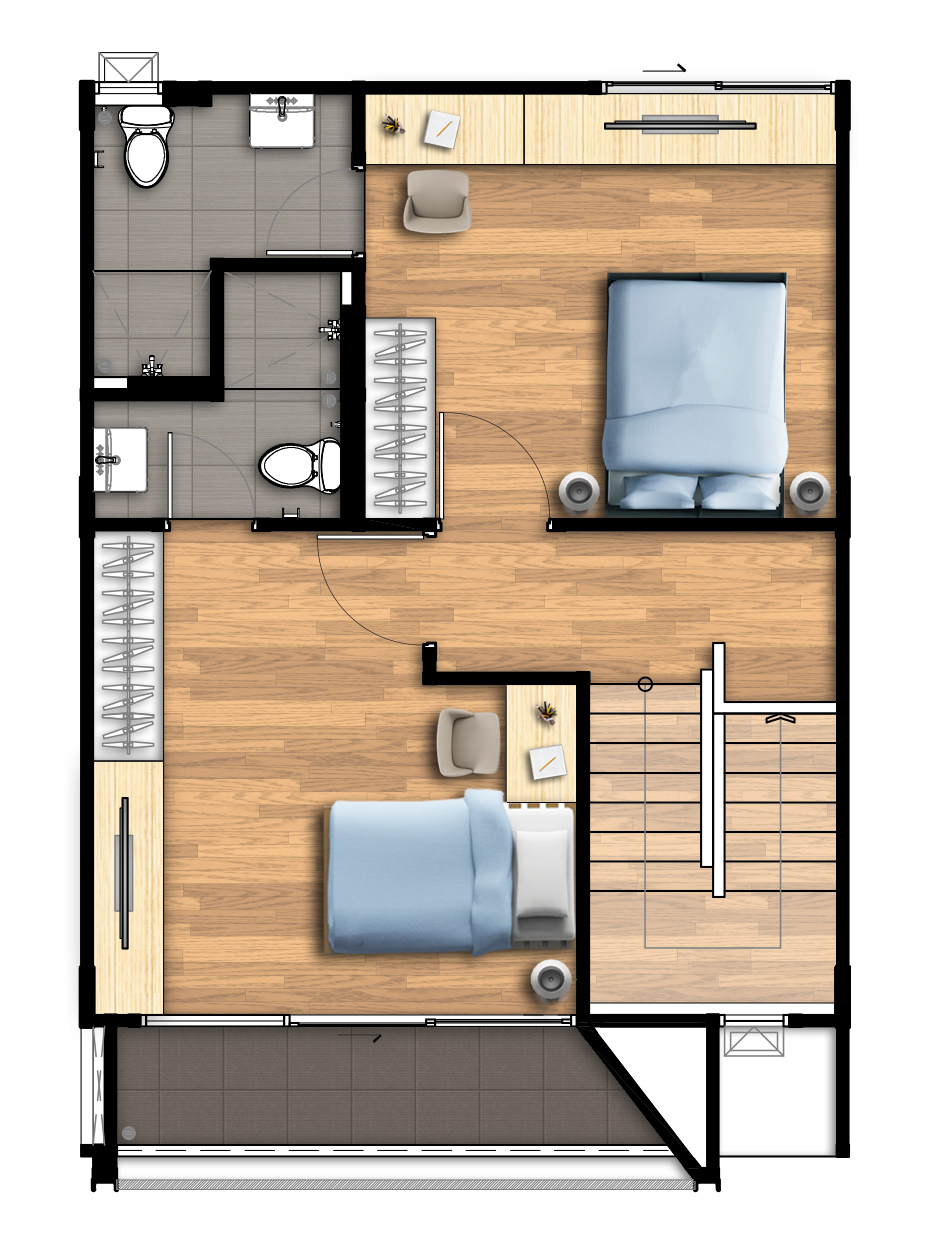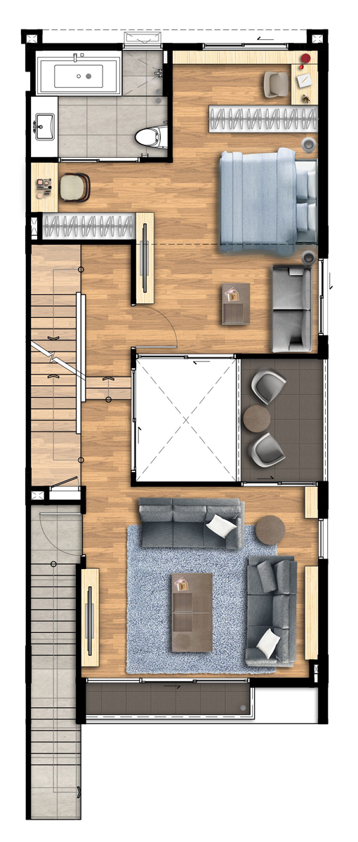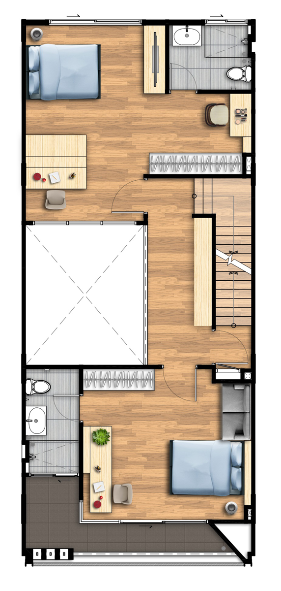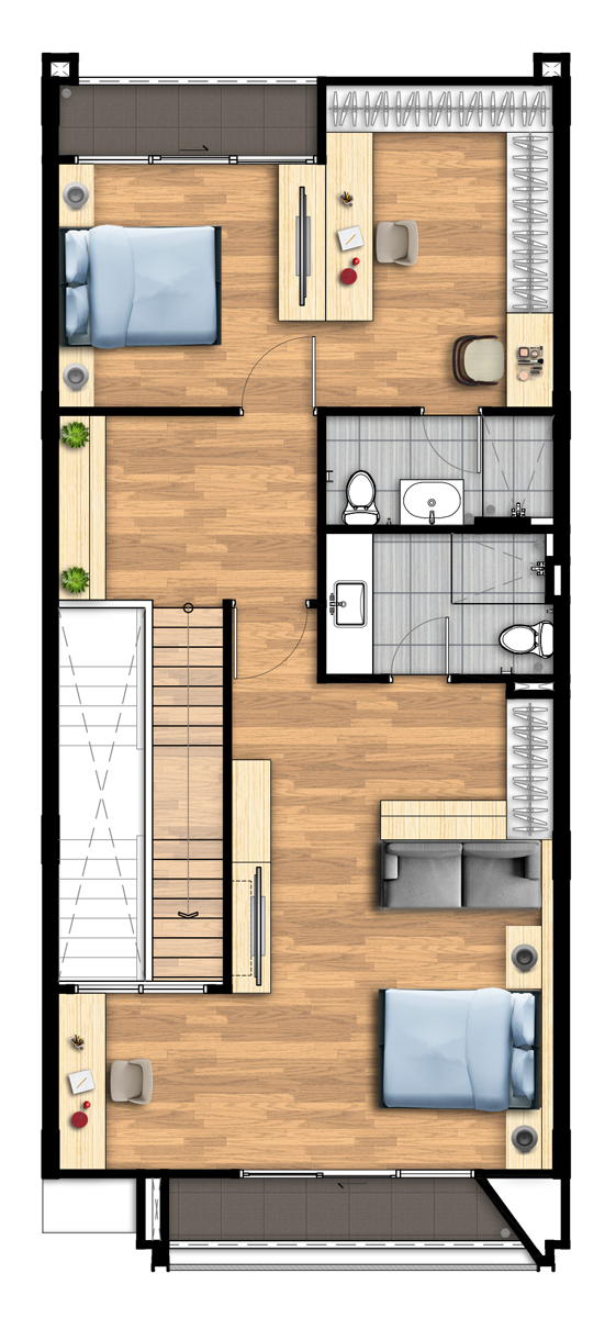 ชั้น 3 3. Type C - ทาวน์โฮม สูง 4 ชั้น เนื้อที่ขนาด 21.1 - 43.7 ตารางวา พื้นที่ใช้สอย 237 ตารางเมตร 3 ห้องนอน 3 ห้องน้ำ 1 ห้องรับแขก ที่จอดรถ 2 คัน