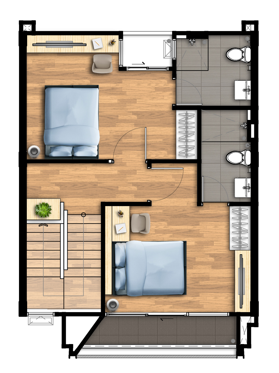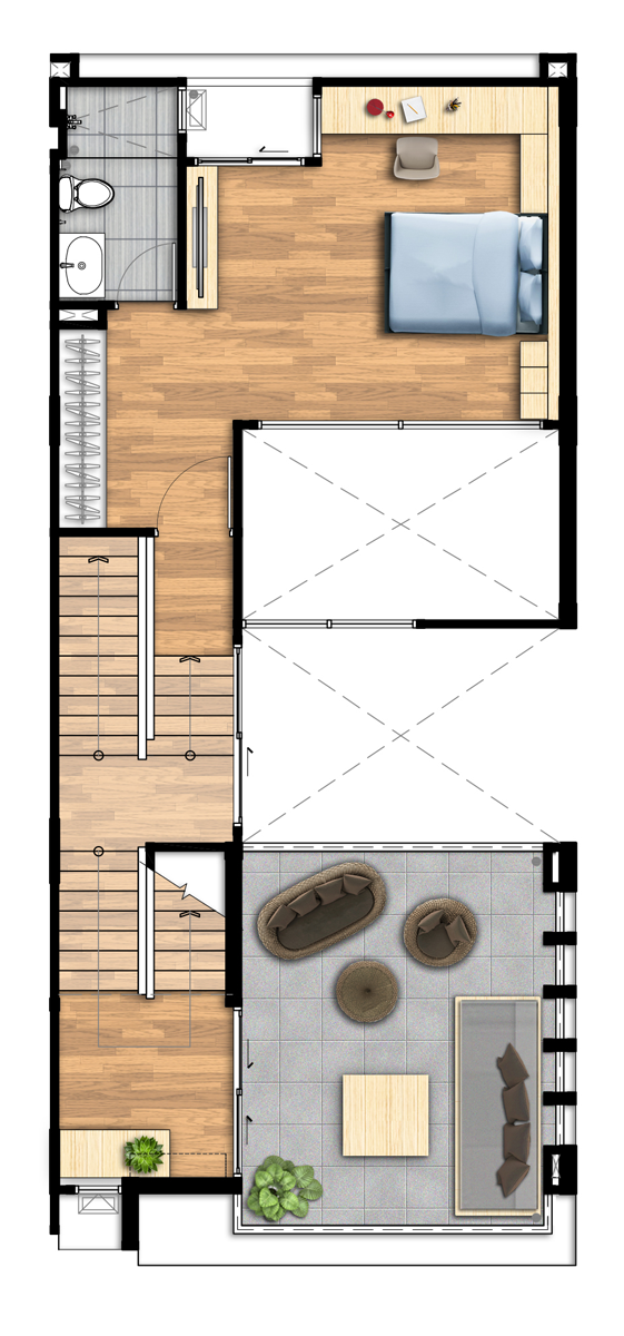 ชั้น 4 4. Type D - ทาวน์โฮม สูง 3 ชั้น เนื้อที่ขนาด 20.8 - 23.7 ตารางวา พื้นที่ใช้สอย 190 ตารางเมตร 3 ห้องนอน 3 ห้องน้ำ 1 ห้องรับแขก ที่จอดรถ 2 คัน