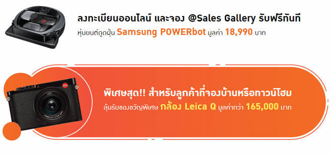 - พิเศษสุด!! สำหรับลูกค้าที่จองบ้านหรือทาวน์โฮม ลุ้นรับของขวัญพิเศษ กล้อง Leica Q มูลค่ากว่า 165,000 บาทพลาดไม่ได้ 31 มี.ค. - 8 เม.ย. นี้ รวมโครงการกว่า 26 โครงการ เพื่อคุณโดยเฉพาะ