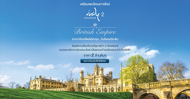 บริษัท แลนด์ แอนด์ เฮ้าส์ จำกัด (มหาชน) เตรียมเปิดตัวบ้านโครงการใหม่ "อินดี้ 2 ศรีนครินทร์ (Indy 2 Srinakarin)" อาณาจักรสไตล์อังกฤษ ในสังคมมีระดับ สัมผัสทาวน์โฮมที่สวยที่สุด แรงบันดาลใจจากเมืองแคมบริดจ์ ครั้งแรกบนทำเลศรีนครินทร์ ใกล้รถไฟฟ้า ลงทะเบียนรับสิทธิพิเศษที่นี่ราคาเริ่มต้น 2 ล้านกว่าบาท** เงื่อนไขเป็นไปตามบริษัทกำหนดสนใจสอบถามเพิ่มเติม โทร. 1198 หรือทางเว็บไซต์ www.lh.co.thแท็กที่เกี่ยวข้อง :