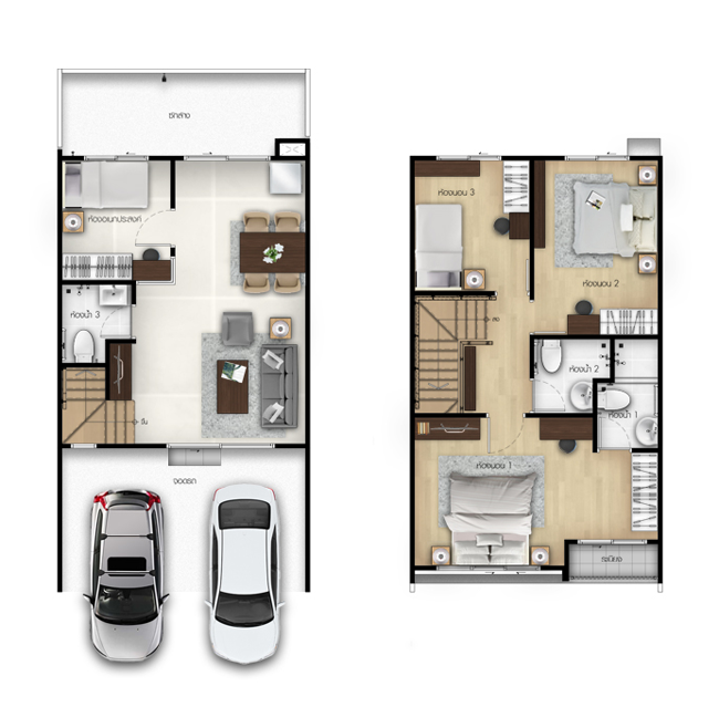 2. LOFT -133 - ทาวน์เฮ้าส์ 2 ชั้น พื้นที่ใช้สอย 133 ตร.ม. หน้ากว้าง 5.7 เมตร 4 ห้องนอน 3 ห้องน้ำ 1 ห้องรับแขก 1 ห้องครัว ส่วนรับประทานอาหาร จอดรถ 2 คัน