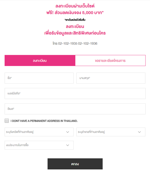 ลงทะเบียนผ่านเว็บไซต์ ฟรี! ส่วนลดเงินจอง 5,000 บาท* (ยกเว้นแปลงโปรโมชั่น) ท่านที่สนใจ สามารถลงทะเบียนเพื่อรับข้อมูลและสิทธิพิเศษก่อนใคร