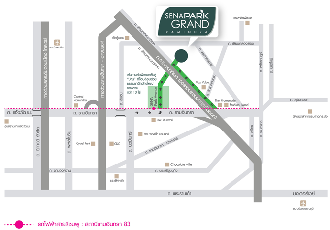 "เสนาพาร์ค แกรนด์ รามอินทรา" ตั้งอยู่บนทำเลที่มีศักยภาพ การเดินทางสะดวกสามารถใช้ถนนหลัก 4 เส้น คือถนนรามอินทรา, ถนนคู้บอน, ถนนวงแหวน และทางด่วนเอกมัย - รามอินทรา โดยปัจจุบันถนนรามอินทรา อยู่ระหว่างการก่อสร้างโครงข่ายการคมนาคมรถไฟฟ้าสายสีชมพูที่เป็นระบบโมโนเรล (รถไฟฟ้ารางเดี่ยว) เส้นทางเริ่มจากแคราย - มีนบุรี ใกล้สถานีรามอินทรา 83 แวดล้อมด้วยสถานศึกษา โรงพยาบาล และห้างสรรพสินค้าชั้นนำ เช่น แฟชั่น ไอส์แลนด์ , ศูนย์การค้า เดอะ พรอมานาด เพียง 1.4 กม.และ MaxValuเตรียมพบกันในงาน Thunder sale 19 - 20 พ.ค.นี้ พร้อมเปิดให้ชมบ้านตัวอย่าง และรับสิทธิพิเศษมากมาย