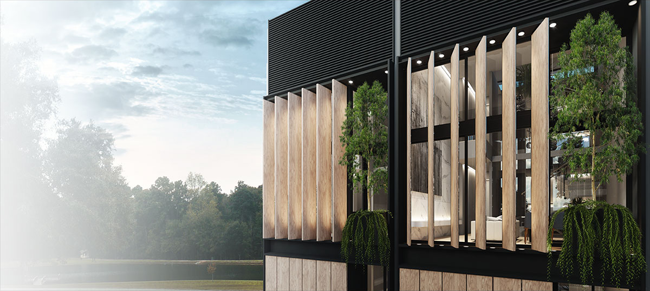 - เรียบหรู และทันสมัยด้วยการใช้อลูมิเนียมลายไม้ด้านนอก และกระจกใสด้านใน ช่วยเรื่อง privacy รวมถึงลดแสงที่จะเข้าตัวอาคาร