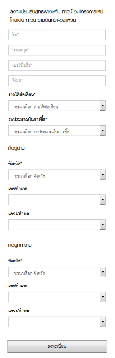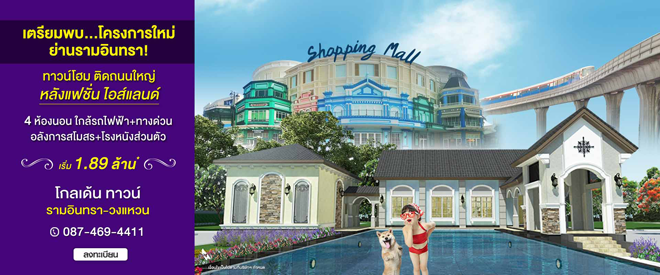 โกลเด้นแลนด์ เปิดให้จองโครงการใหม่ โกลเด้น ทาวน์ รามอินทรา - วงแหวน (Golden Town Ranintra - Wongwaen) สุดยอดทาวน์โฮม ทำเลดีที่สุด ติดถนนใหญ่ หลังแฟชั่นไอส์แลนด์ มาพร้อมฟังก์ชัน 4 ห้องนอน สไตล์อังกฤษ อลังการสโมสร+โรงหนังส่วนตัว อีกทั้งยังใกล้ รถไฟฟ้า+ทางด่วน ท่านที่สนใจสามารถลงทะเบียนจอง เพื่อรับส่วนลดเพิ่ม 20,000 บาท* ได้ที่เว็บไซต์ของโกลเด้นแลนด์ราคาเริ่มเพียง 1.89 ล้าน*ผู้ที่สนใจ สามารถลงทะเบียนเพื่อรับสิทธิพิเศษส่วนลดเพิ่ม 20,000 บาท ได้ที่ลิงก์ข้างล่างนี้สอบถามข้อมูลเพิ่มเติม โทร 087-469-4411 เว็บไซต์ www.goldenland.co.th และ Fanpage : https://www.facebook.com/GOLDENLANDข่าว-โปรโมชั่นล่าสุดอื่นๆ