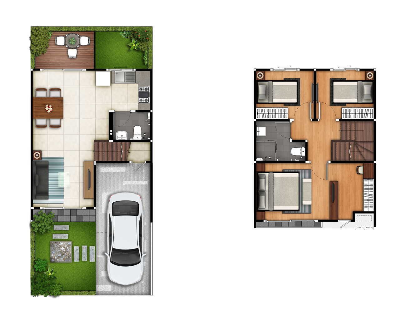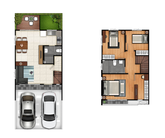 2. แบบบ้าน HX2 - ทาวน์โฮม 2 ชั้น หน้ากว้าง 5.7 เมตร พื้นที่ใช้สอยประมาณ 113.50 ตร.ม. ขนาด 3 ห้องนอน 2 ห้องน้ำ 1 ห้องรับแขก 1 ส่วนรับประทานอาหาร 1 Panty จอดรถ 2 คัน
