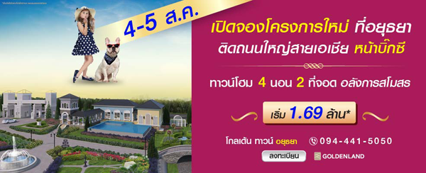 โกลเด้น ทาวน์ อยุธยา (Golden Town Ayutthaya)" 4 - 5 สิงหาคม 2561 นี้ พบกับทาวน์โฮมสุดหรูสไตล์อังกฤษ 4 ห้องนอน 3 ห้องน้ำ ทำเลดี ติดถนนใหญ่สายเอเชีย ใกล้ BIG C อยุธยา สำหรับทาวน์โฮมที่นี่มีให้เลือก 3 แบบ เป็นทาวน์โฮม 2 ชั้น บนเนื้อที่ 42 ไร่ จำนวน 455 หลัง พื้นที่ใช้สอยตั้งแต่ 96 - 117 ตร.ม. รายล้อมไปด้วยสาธารณูปโภคที่ครบครันภายในโครงการ ทั้งคลับเฮาส์หรู สระว่ายน้ำ ทะเลสาบ สวนพักผ่อนขนาดใหญ่ สวนน้ำพุ และสนามเด็กเล่น