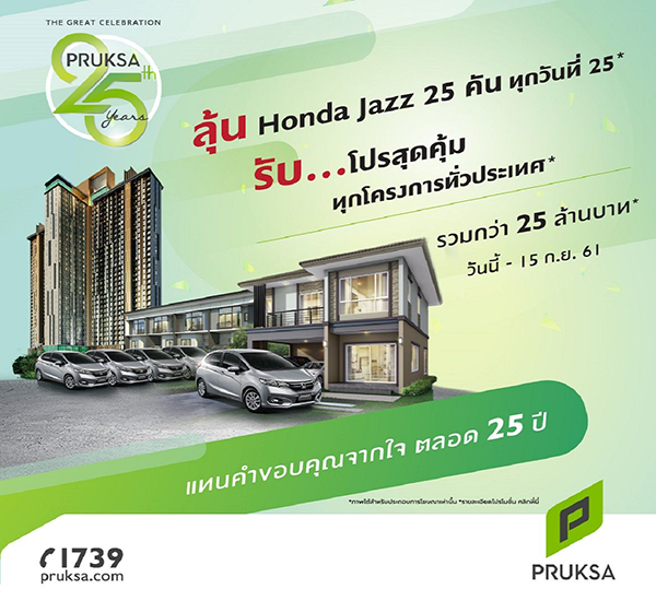 โปรโมชั่น: พฤกษาจัดแคมเปญ "แทนคำขอบคุณจากใจ ตลอด 25 ปี" ลุ้น Honda Jazz 25 คัน ทุกวันที่ 25* รับ...โปรสุดคุ้ม ทุกโครงการทั่วประเทศ* รวมกว่า 25 ล้านบาท* วันนี้ - 15 กันยายน 2561