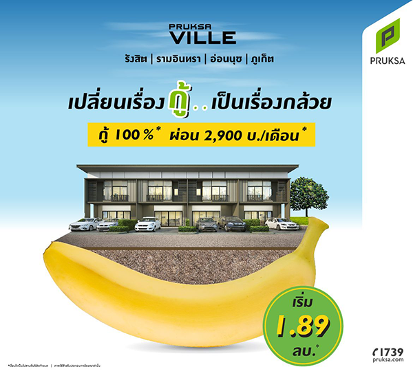 โปรโมชั่น: เปลี่ยนเรื่อง กู้... เป็นเรื่องกล้วย กับโครงการ Pruksa Ville รังสิต | รามอินทรา | อ่อนนุช | ภูเก็ต กู้ 100% ผ่อน 2,900 บาท/เดือน* ราคาเริ่มต้น 1.89 ล้านบาท