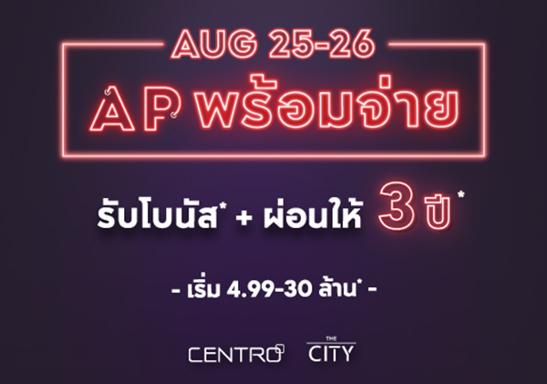 โปรโมชั่น: 25 - 26 สิงหาคม 2561 นี้ AP พร้อมจ่าย!! โปรนี้มีแต่ให้ รับเลยไม่ต้องลุ้น ฟรี! โบนัสสูงสุด 300,000 บาท* + AP ช่วยคุณผ่อน นาน 3 ปี* กับบ้านเดี่ยวพร้อมอยู่บนสุดยอดทำเล กว่า 25 โครงการ เริ่ม 4.99 - 30 ล้านบาท*