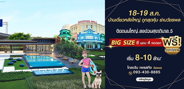 โกลเด้น เพรสทีจ วัชรพล-สุขาภิบาล 5 วันที่ 18 - 19 สิงหาคม 2561 นี้ พลาดไม่ได้!! บ้านเดี่ยวหลังใหญ่ ถูกสุดคุ้ม ย่านวัชรพล จองเลย... ฟรี ทุกค่าใช้จ่าย*! BIG SIZE 6 ห้องนอน 4 ที่จอดรถ พร้อมห้องพักผ่อน และห้องแม่บ้าน อลังการสโมสรสุดหรูและสวนธรรมชาติรอบโครงการ บนทำเลศักยภาพ ติดถนนใหญ่ ลงทางด่วนสุขาภิบาล 5 เริ่ม 8-10 ล้าน*