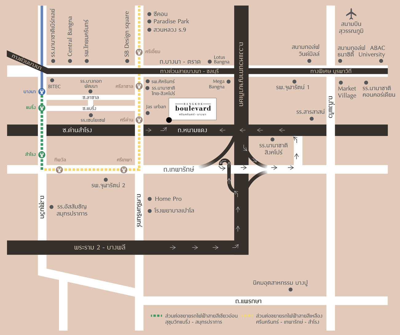 - ใกล้รถไฟฟ้าสายสีเขียวอ่อน สำโรง - หมอชิต และรถไฟฟ้าสายสีเหลือง ลาดพร้าว-สำโรง สถานี ศรีด่าน