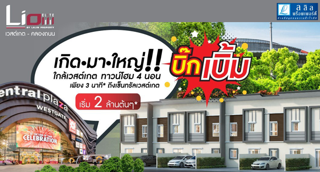 บริษัท ลลิล พร็อพเพอร์ตี้ จำกัด (มหาชน) จัดโปรโมชั่นโครงการ "ไลโอ อีลิท กาญจนาภิเษก - เวสต์เกต คลองถนน Lio ELITE Townhome Kanchanaphisek - Westgate" ทาวน์โฮมที่ เกิด-มา-ใหญ่ !! สุดคุ้มในทำเลใกล้เซ็นทรัล เวสต์เกต ทาวน์โฮมใหญ่บิ๊กเบิ้ม กว้างกว่าใคร ในทำเลใกล้กว่า แต่ถูกกว่า ทาวน์โฮม 4 ห้องนอน ใกล้เวสต์เกต เริ่มเพียง 2 ล้านต้นๆ **พบกับโปรโมชั่นพิเศษ- ฟรี แอร์ + ค่าใช้จ่ายในการโอน + ค่าส่วนกลาง **