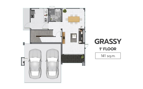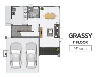 1. แบบบ้าน GRASSY - บ้านเดี่ยว 2 ชั้น ขนาด 3 ห้องนอน 3 ห้องน้ำ 2 ที่จอดรถ พื้นที่ใช้สอย 141 ตร.ม. ห้องนอนกว้างขวาง พร้อม Walk-in Closet และห้องน้ำในตัว โปร่ง โล่งสบาย ในห้องรับแขกที่สมาชิกจะได้ใช้เวลาร่วมกัน ห้องครัวแบ่งเป็นสัดส่วนออกจากห้องรับประทานอาหาร