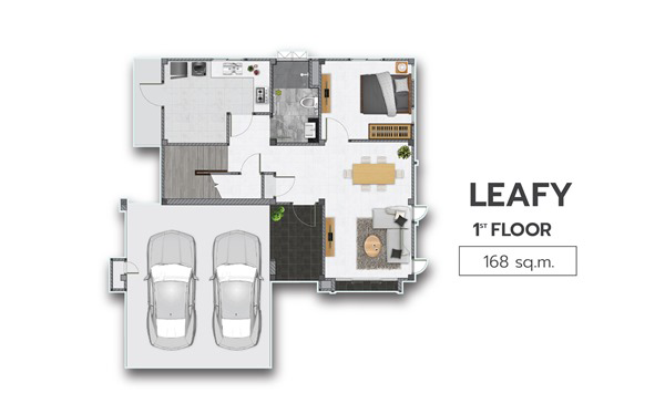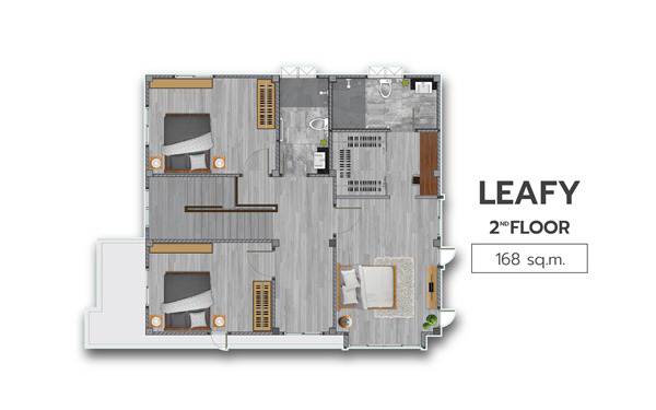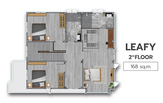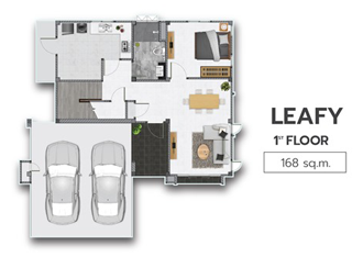 2. แบบบ้าน LEAFY - บ้านเดี่ยว 2 ชั้น ขนาด 4 ห้องนอน 3 ห้องน้ำ 2 ที่จอดรถ พื้นที่ใช้สอย 168 ตร.ม. ห้องนอนใหญ่ กว้างขวาง แยกเป็นสัดส่วน มีโซน Walk-in Closet พร้อมห้องน้ำในตัว ห้องรับแขก และห้องครัว รองรับไลฟ์สไตล์ของสมาชิกในครอบครัว