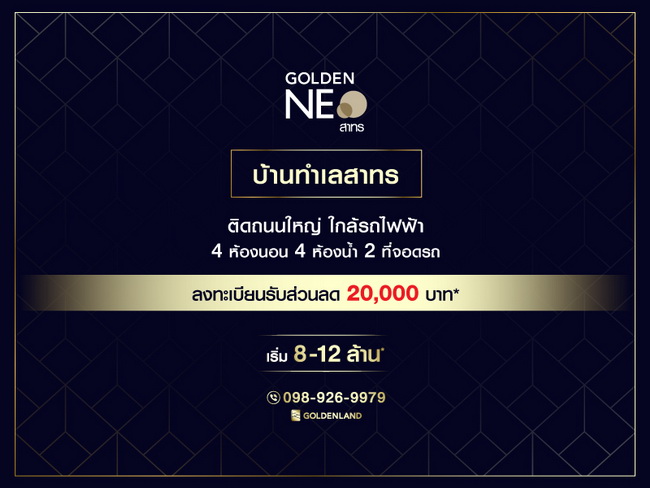 โกลเด้น นีโอ สาทร หลุดจอง!! แปลงสวย หน้าสวน สุดยอดทำเลศักยภาพ ย่านสาทร บนที่ดินผืนสุดท้าย ใกล้รถไฟฟ้า พบบ้าน นีโอโฮม สไตล์อังกฤษ 4 ห้องนอน 4 ห้องน้ำ พร้อมห้องพระและสวนธรรมชาติ เริ่ม 8-12 ล้าน*
