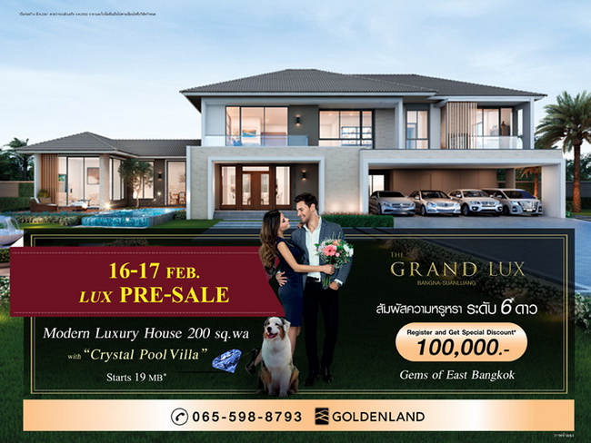 เดอะ แกรนด์ ลักซ์ บางนา-สวนหลวง 16-17 กุมภาพันธ์ 2562 นี้ LUX PRE-SALE พร้อมเปิดจองแล้ว! โครงการใหม่บนทำเลบางนา พบนิยามของความหรูหราระดับ 6 ดาว! THE GRAND LUX บางนา-สวนหลวง พร้อมให้คุณครอบครองได้ในราคาเริ่ม 19 ล้าน*