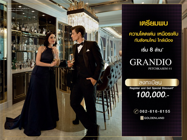 แกรนดิโอ เพชรเกษม 81 เตรียมพบ ความโดดเด่นเหนือระดับ กับสังคมใหม่ ใกล้เมือง A NEW REMARKABLE LIVING AWAITS เริ่ม 8 ล้านบาท* สอบถามข้อมูลเพิ่มเติม โทร. 062-616-6155