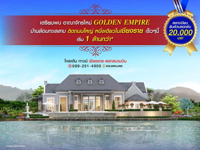โกลเด้น ทาวน์ เชียงราย-แยกสนามบิน เตรียมพบ ปรากฎการณ์ครั้งยิ่งใหญ่ บนอาณาจักรใหม่ GOLDEN EMPIRE บ้านล้อมทะเลสาบ ติดถนนใหญ่ หนึ่งเดียวในเชียงราย ใกล้สนามบิน เร็วๆนี้... เริ่มต้นเพียง 1 ล้านกว่าบาท*