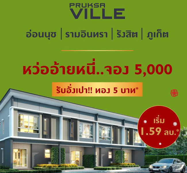 www.goldenland.co.th โปรโมชั่น: Pruksa Ville อ่อนนุช | รามอินทรา | รังสิต | ภูเก็ต หว่ออ้ายหนี่.. จอง 5,000 รับอั่งเปา!! ทอง 5 บาท* ราคาเริ่มต้น 1.59 ล้านบาท