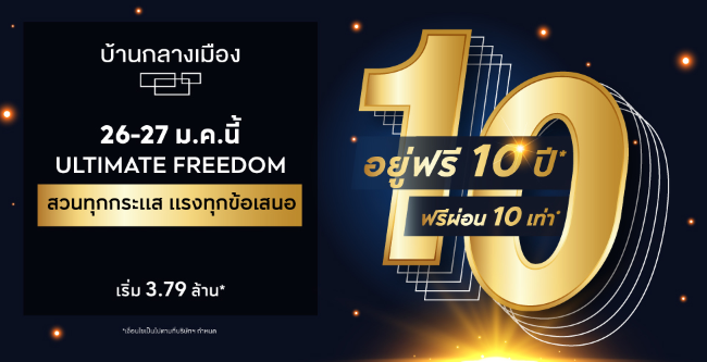 ดูโครงการที่เข้าร่วมโปรโมชั่นและลงทะเบียนรับส่วนลดสูงสุด 50,000 บาทได้ที่นี่ โปรโมชั่น: บ้านกลางเมือง Ultimate Freedom สวนทุกกระแส แรงทุกข้อเสนอ 26 - 27 มกราคม 2562 นี้ อยู่ฟรี 10 ปี* ฟรีผ่อน 10 เท่า* เริ่ม 3.79 ล้านบาท