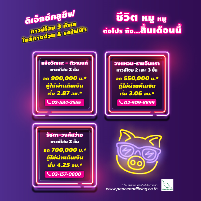 บริษัท พีซแอนด์ลีฟวิ่ง จำกัด จัดโปรโมชั่นต้อนรับปีหมูกับชีวิตหมูๆ ถึงสิ้นเดือนเท่านั้น! กับ "ดิ เอ็กซ์คลูซีฟ" ทาวน์โฮมบนทำเลศักยภาพ 3 โครงการ ดังต่อไปนี้