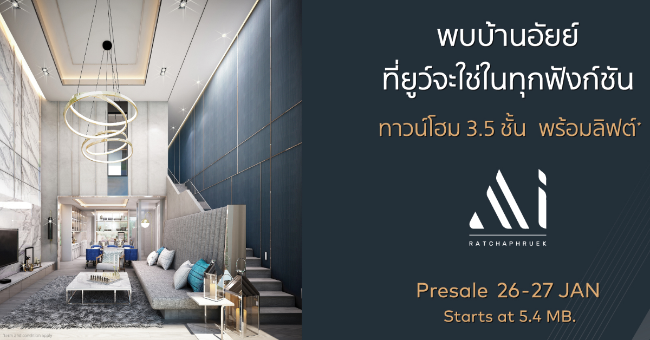 พบบ้าน "อัยย์ ราชพฤกษ์" 26 - 27 ม.ค. นี้ เปิดเข้าชมบ้านตัวอย่างครั้งแรก ทาวน์โฮม 3.5 ชั้น พร้อมลิฟต์* เริ่ม 5.4 ล้านบาท ลงทะเบียนรับสิทธิพิเศษ