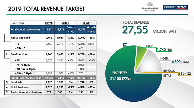 สำหรับประมาณการรายได้ของกลุ่มบริษัทปีนี้ ตั้งไว้ที่ 27,555 ล้านบาท ประกอบด้วยรายได้ของ พร็อพเพอร์ตี้ เพอร์เฟค 20,000 ล้านบาท รายได้ของ แกรนด์ แอสเสทฯ 1,100 ล้านบาท รายได้จากธุรกิจโรงแรม 4,500 ล้านบาท รายได้จากการขายที่ดิน 1,740 ล้านบาท และ จากธุรกิจให้เช่าอีก 215 ล้านบาท โดยมั่นใจว่าจะสามารถทำได้ตามเป้า ซึ่งปีนี้กลุ่มบริษัทมียอดขายรอรับรู้รายได้ (Backlog) อยู่ถึง 32.29% หรือ 6,813 ล้านบาท ในส่วนของธุรกิจโรงแรมของกลุ่มบริษัท ปีนี้ประมาณการรายได้จากธุรกิจโรงแรมจะเพิ่มขึ้นจากโรงแรมรอยัล ออคิด เชอราตัน ซึ่งได้รับผลจากการเปิดตัวของไอคอนสยาม นอกจากนี้ ยังจะเพิ่มขึ้นจากการเปิดตัวโรงแรมไฮแอท รีเจนซี่ สุขุมวิท อย่างเป็นทางการในเดือนมีนาคมนี้ พร้อมทั้งยังมีการเปิดบริการห้องอาหารรูฟท็อป และเน้นธุรกิจ MICE เพื่อเพิ่มรายได้ในส่วนของอาหารและเครื่องดื่ม