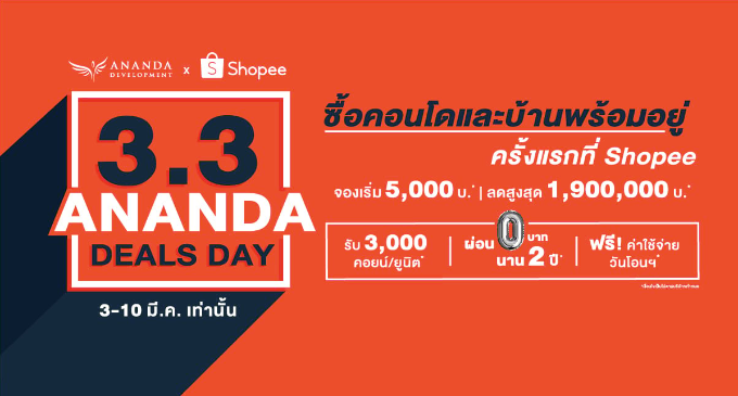 โปรโมชั่น : "Ananda Deals Day" ซื้อบ้านพร้อมอยู่ ครั้งแรกที่ Shopee จองเริ่ม 5,000 บาท* ลดสูงสุด 1,900,000 บาท รับ 3,000 คอยน์/ยูนิต* ผ่อน 0 บาท นาน 2 ปี ฟรี! ค่าใช้จ่ายวันโอนฯ* 3-10 มีนาคม 2562 นี้ เท่านั้น