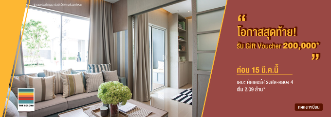 เดอะ คัลเลอร์ส รังสิต - คลอง 4" โอกาสสุดท้าย รับ Gift Voucher 200,000 บาท* ก่อน 15 มีนาคม 2562 นี้ เริ่ม 2.09 ล้านบาท*
