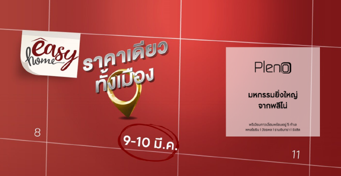 โปรโมชั่น : Easy Home ราคาเดียวทั้งเมือง Pleno มหกรรมยิ่งใหญ่จากพลีโน่ พรีเมียมทาวน์โฮมพร้อมอยู่ 5 ทำเล 9-10 มีนาคม 2562 นี้ โอกาสเดียวต้องรีบคว้าทุกทำเลราคาเดียว ดีลดีที่สุดแห่งปี ก่อนมาตรการรัฐ