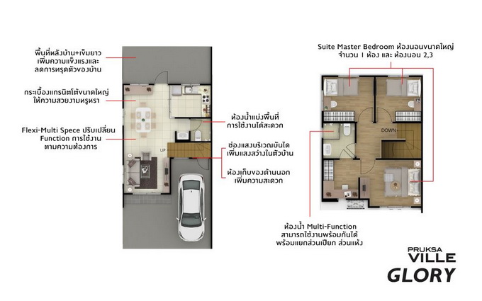 2. แบบบ้าน GLORY พื้นที่ใช้สอย ประมาณ 95 ตร.ม. หน้ากว้าง 5.7 เมตร 3 ห้องนอน 2 ห้องน้ำ 1 ที่จอดรถ