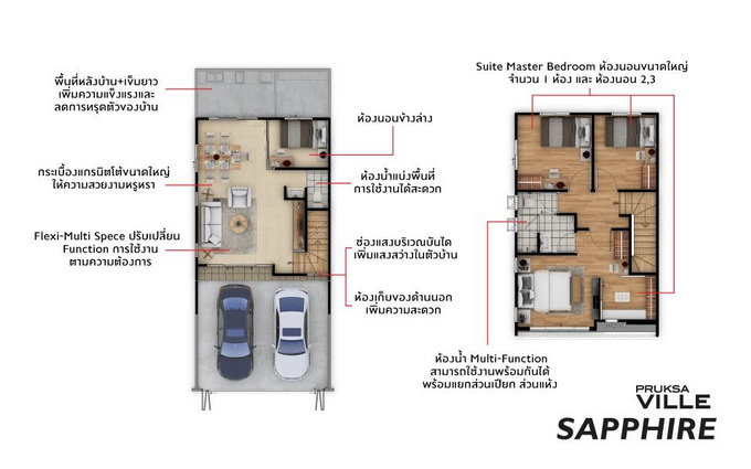 1. แบบบ้าน SAPPHIRE พื้นที่ใช้สอยประมาณ 98 ตร.ม. หน้ากว้าง 5.7 เมตร 4 ห้องนอน 2 ห้องน้ำ 1 ที่จอดรถ