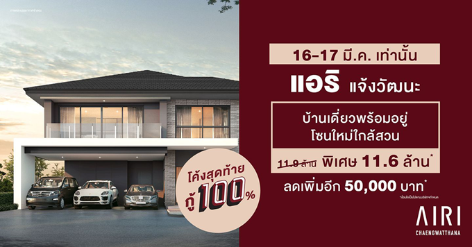 โปรโมชั่น : แอริ แจ้งวัฒนะ บ้านเดี่ยวพร้อมอยู่ โซนใหม่ใกล้สวน ราคาพิเศษ 11.6 ล้าน*