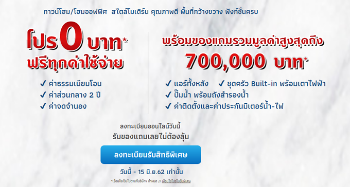 ทาวน์โฮม/โฮมออฟฟิศ 3 ชั้นครึ่ง สไตล์โมเดิร์น คุณภาพดี พื้นที่กว้างขวาง ฟังก์ชันครบ รับโปรโมชั่น ฟรีทุกค่าใช้จ่าย พร้อมของแถมรวมมูลค่าสูงสุดถึง 7 แสนบาท* ลงทะเบียนออนไลน์วันนี้ รับของแถมเลยไม่ต้องลุ้น