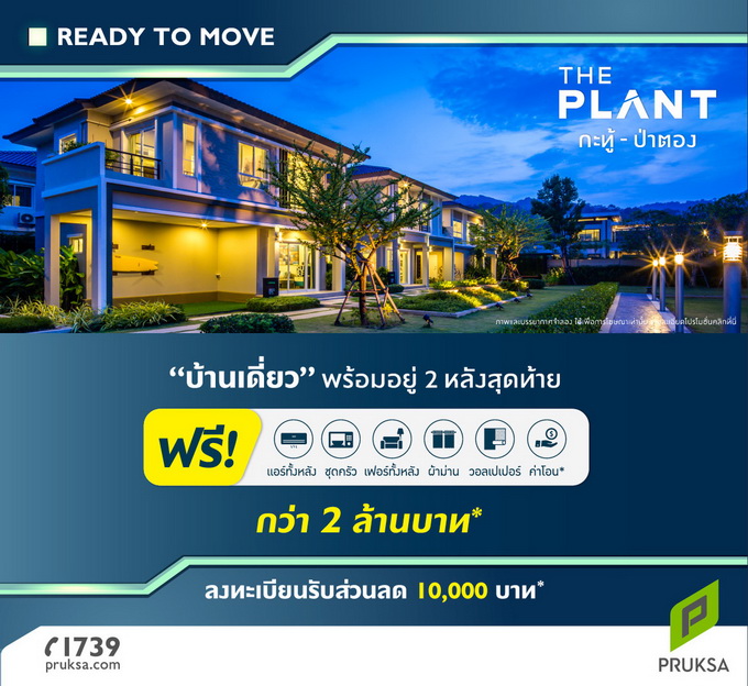 เดอะ แพลนท์ กะทู้ - ป่าตอง" บ้านเดี่ยวพร้อมอยู่ 2 หลังสุดท้าย ฟรี! แอร์ทั้งหลัง / ชุดครัว / เฟอร์ฯ ทั้งหลัง / ผ้าม่าน / วอลเปเปอร์ / ค่าโอน* กว่า 2 ล้านบาท* ลงทะเบียนรับส่วนลด 10,000 บาท*