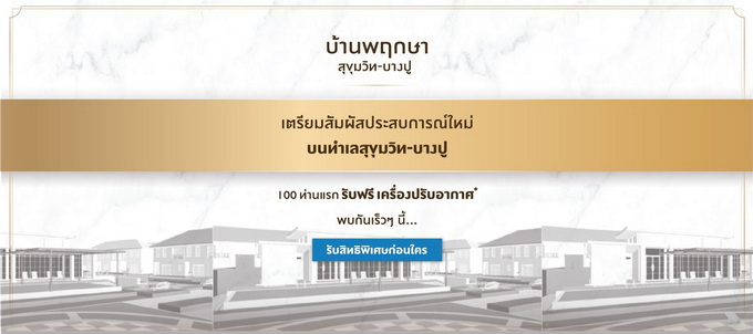 บ้านพฤกษา สุขุมวิท - บางปู" เตรียมสัมผัสประสบการณ์ใหม่ บนทำเลสุขุมวิท - บางปู ลงทะเบียนออนไลน์ 100 ท่านแรก รับฟรี! เครื่องปรับอากาศ*